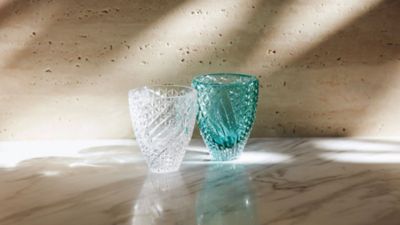 Cased glass, which consists of fused layers of different colors, was specifically chosen to produce the lovely turquoise shade. When carved by hand, the colorful inner layer is playfully revealed. And while traditional techniques were employed in the making of each piece, their creation underscores an exciting evolution in the art of Kiriko. These beautiful glasses were born from the collaboration between Lexus and Studio Kobin, both of whom embrace the values of traditional craftsmanship while continuing to push the boundaries. Because sooner or later, beauty breaks the rules.